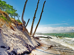 Der Weststrand ist ein richtiger Naturstrand mit Wald bis an die Randdüne. Die ersten Baumreihen sind oft „Windflüchter“, windgebeugte Bäume. Über den wilden Seestrand wandern Sie zum Darßer Ort mit seinem Leuchtturm, danach zurück nach Prerow.